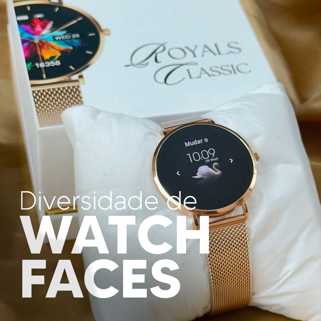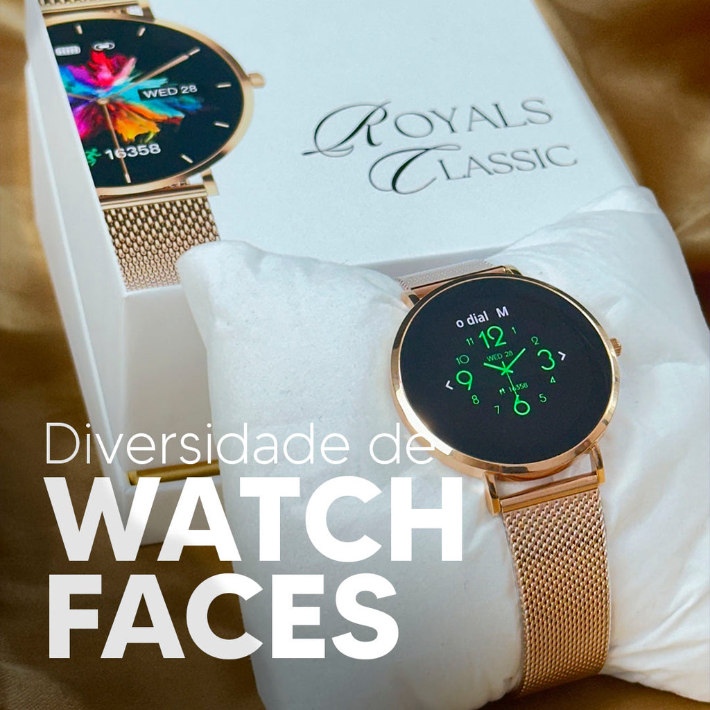 Um smartwatch que exala elegância e sofisticação, inspirado na grandeza da realeza clássica e nas mais tradicionais joias da família real, ROYALS CLASSIC foi criado design único, fino e luxuoso sendo a união perfeita de bom gosto e tecnologia, contando com sua tela AMOLED de alta resolução, revestimento Gorilla glass genuíno e caixa de aço inoxidável 40mm. Viva o seu tempo com a real tecnologia Royals Classic.